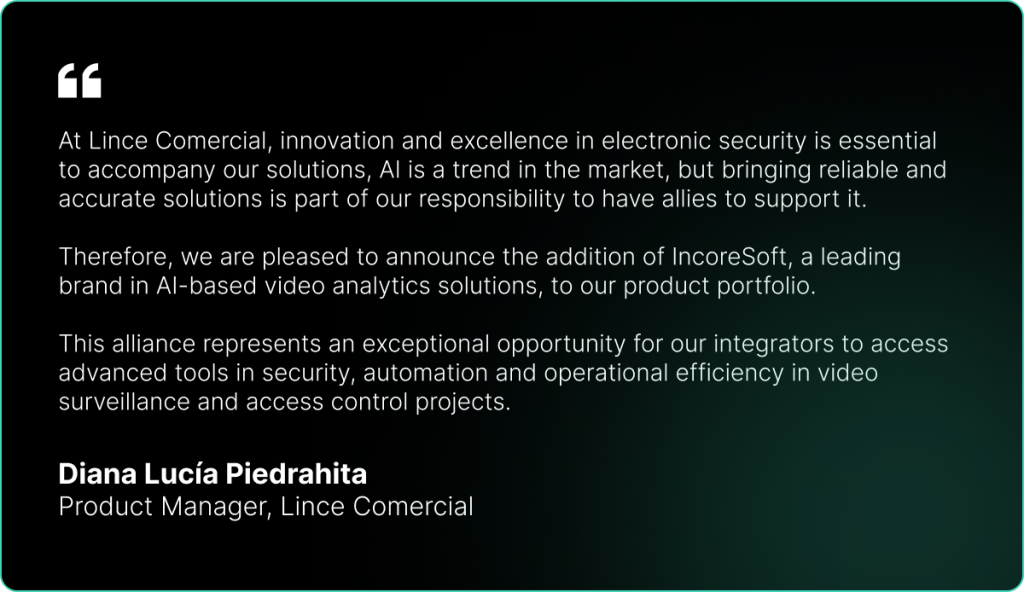 IncoreSoft, a leader in AI Video Analytics, is pleased to announce a new partnership with Lince Comercial, one of the leading Colombian distributors of security technology solutions. Since 1997, Lince Comercial has been providing top-notch security solutions and exceptional ongoing support to authorized installers.